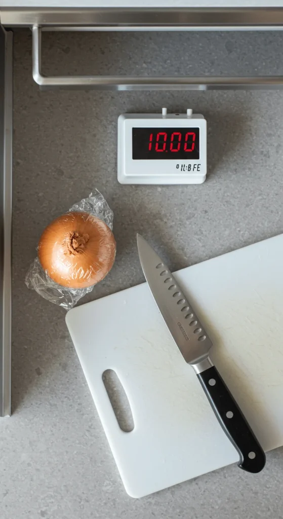 - Chill the onion in the fridge (or freezer for 10–15 minutes) before cutting to slow the reaction.