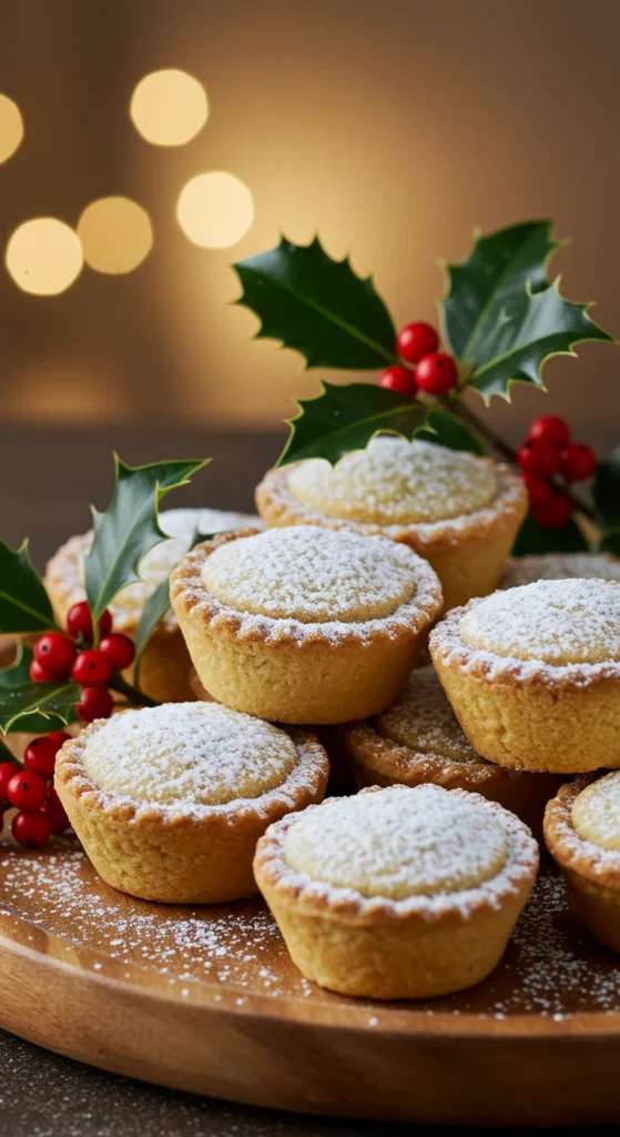 Mince pies are a British holiday tradition. The filling combines dried fruit, apples, spices, and a touch of brandy. Spoon into small pastry cases and bake until golden.