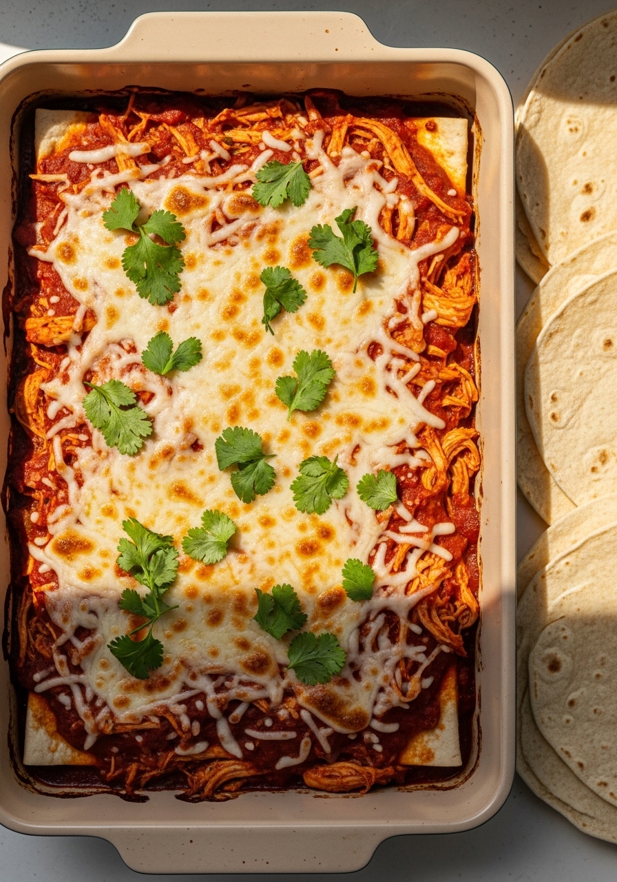 - Pour green chiles, enchilada sauce, and chicken broth over chicken.
