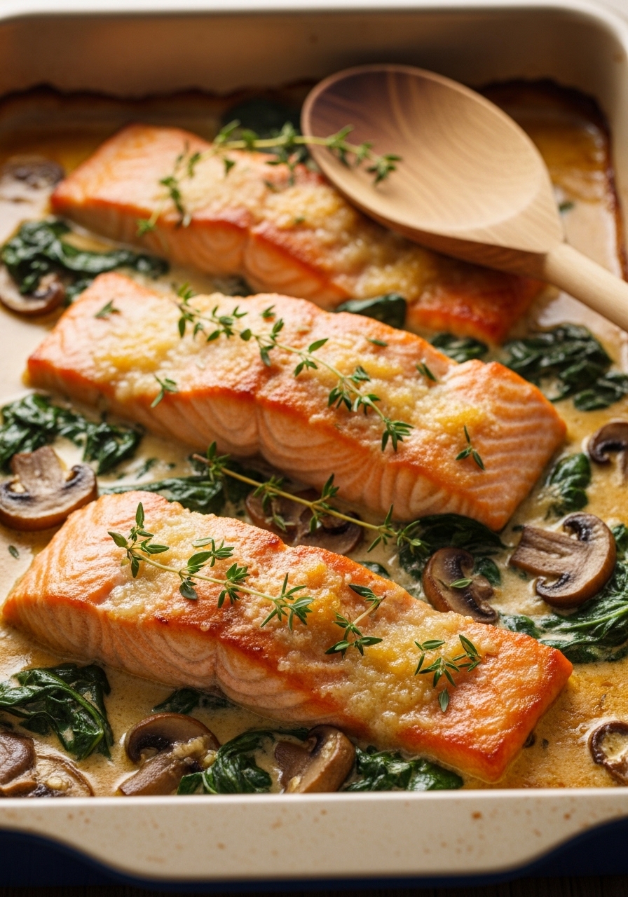 4. Creamy Baked Salmon with Mushrooms and Spinach