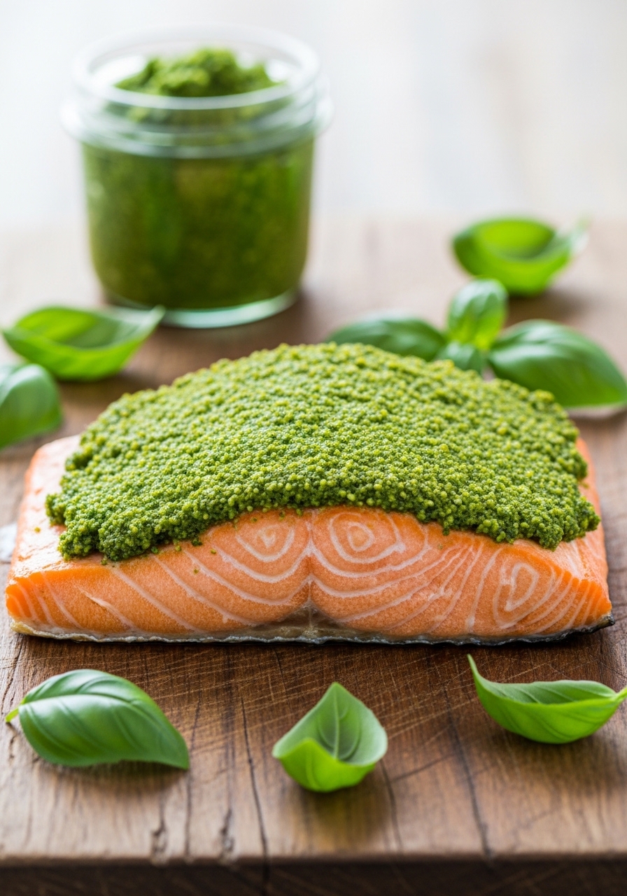 Pesto adds herbaceous nuttiness and a pretty green crust that bakes pleasantly on salmon. Use store-bought for speed or homemade for extra freshness.