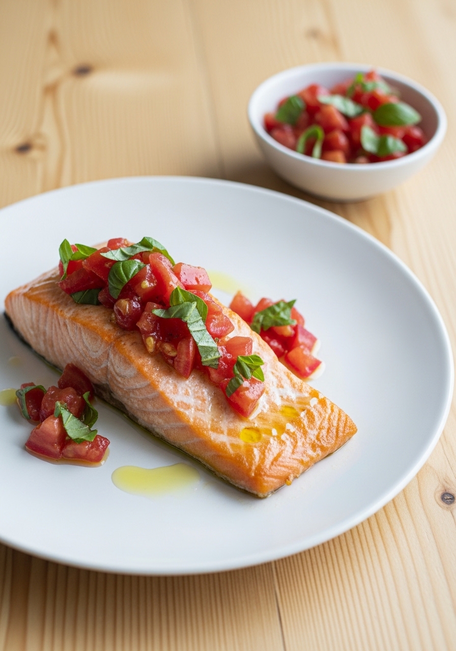 A fresh tomato-basil topping turns salmon into a Mediterranean-style meal with bright flavors and a light finish.