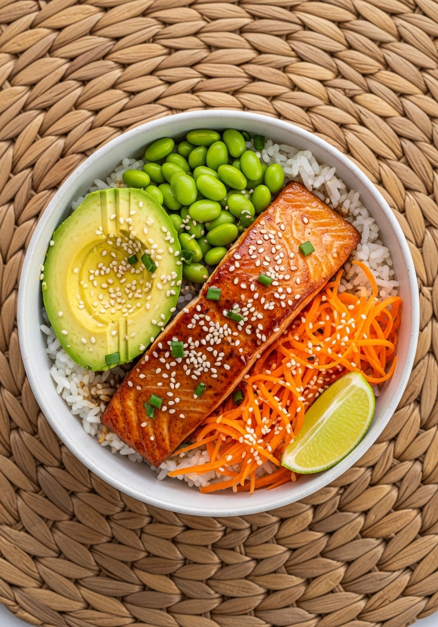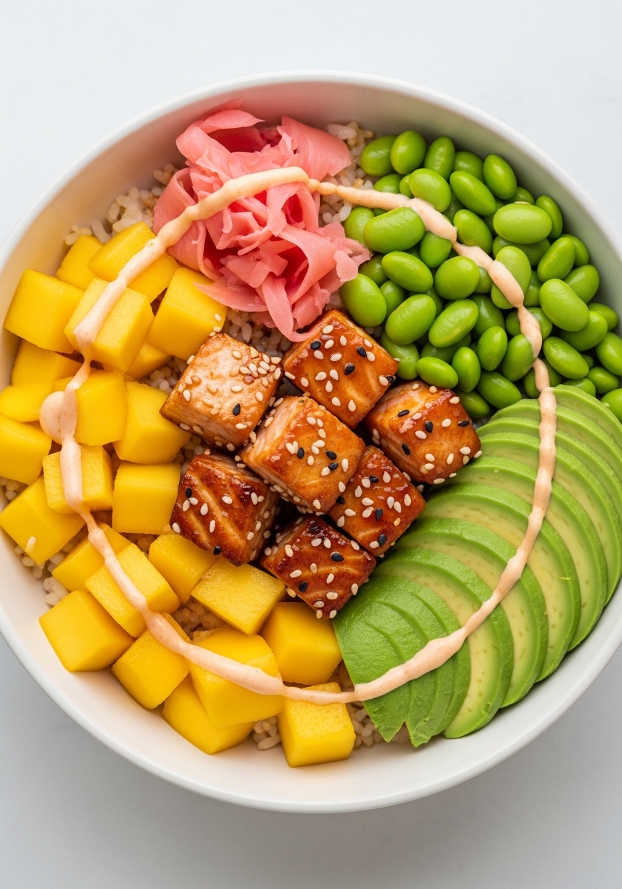 - Build bowls with rice, mango, edamame, avocado, and salmon; drizzle with spicy mayo.