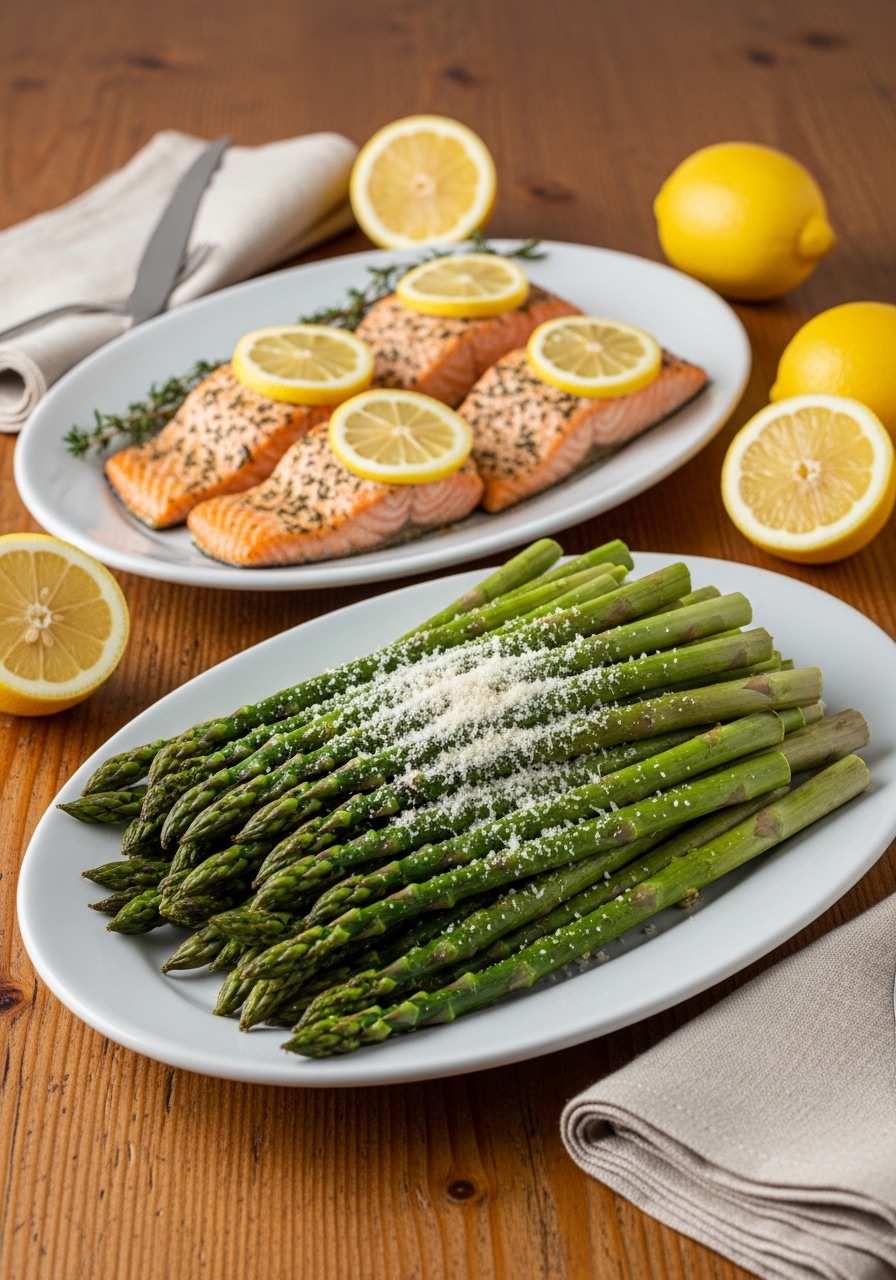 A true weeknight classic: salmon and veggies all on one pan, minimal cleanup and big flavor. The salmon stays moist under a lemon-garlic drizzle while the asparagus roasts to tender-crisp. This is perfect for meal prep or a quick family dinner.