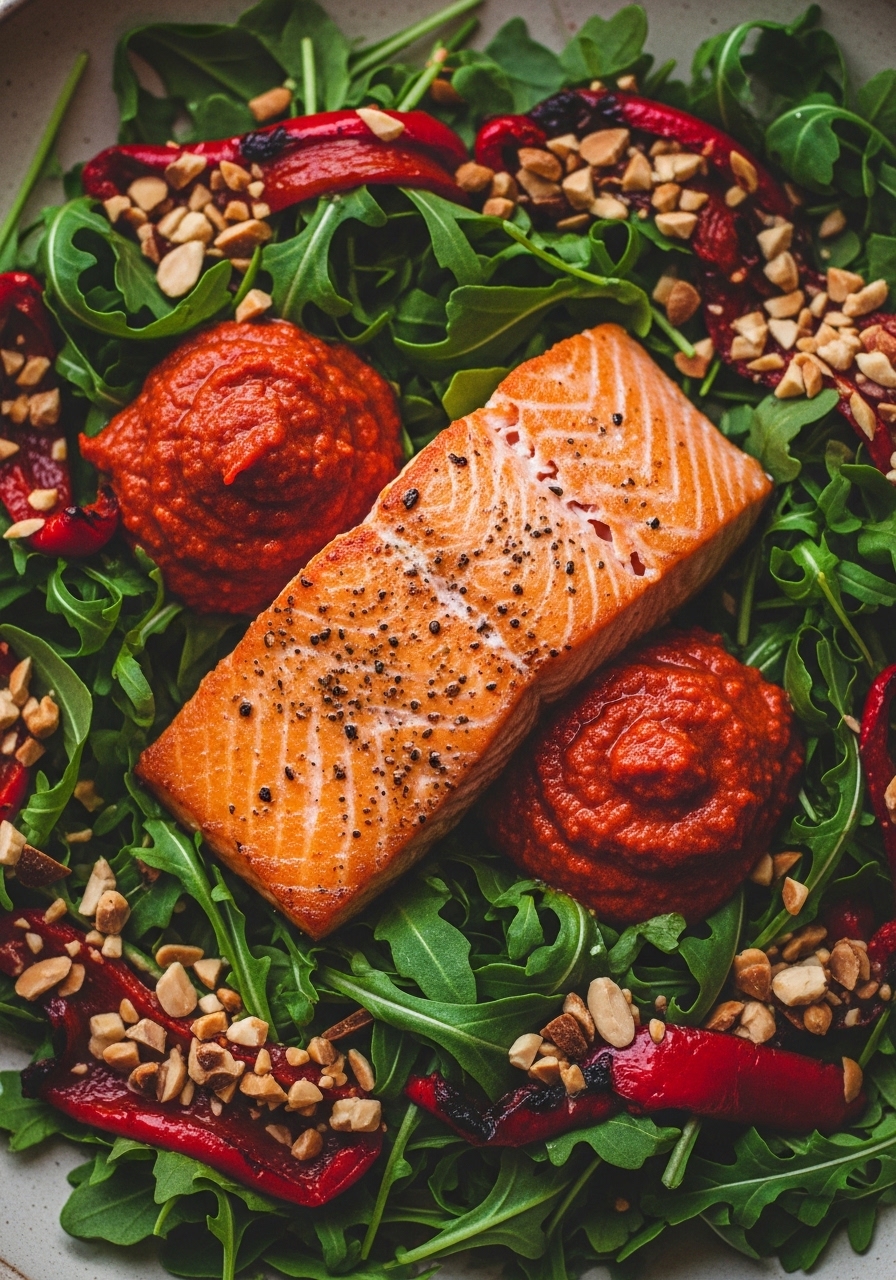 Romesco sauce brings smoky Spanish flavor to salmon. Paired with roasted peppers and arugula, it makes a bright, sophisticated salad that’s still doable on a weeknight.