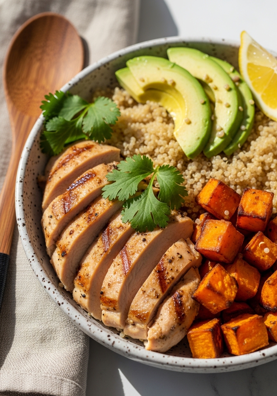 - Build bowls with quinoa, roasted sweet potato, sliced chicken, and avocado. Garnish with cilantro and a squeeze of lemon.