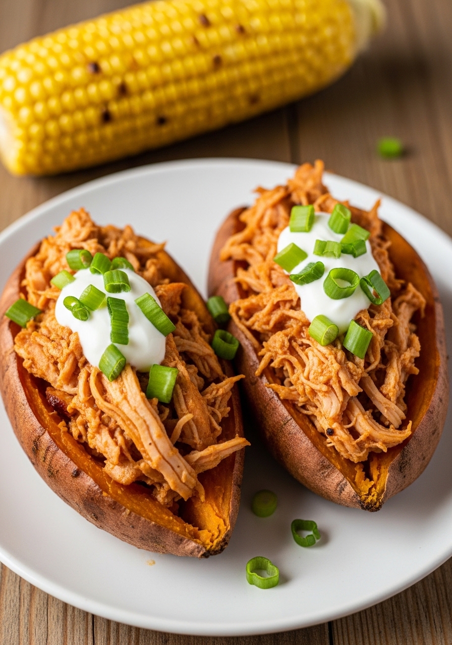 Baked sweet potatoes make a cozy, portable base for shredded BBQ chicken—comforting, protein-packed, and easy. Use rotisserie chicken to save time.