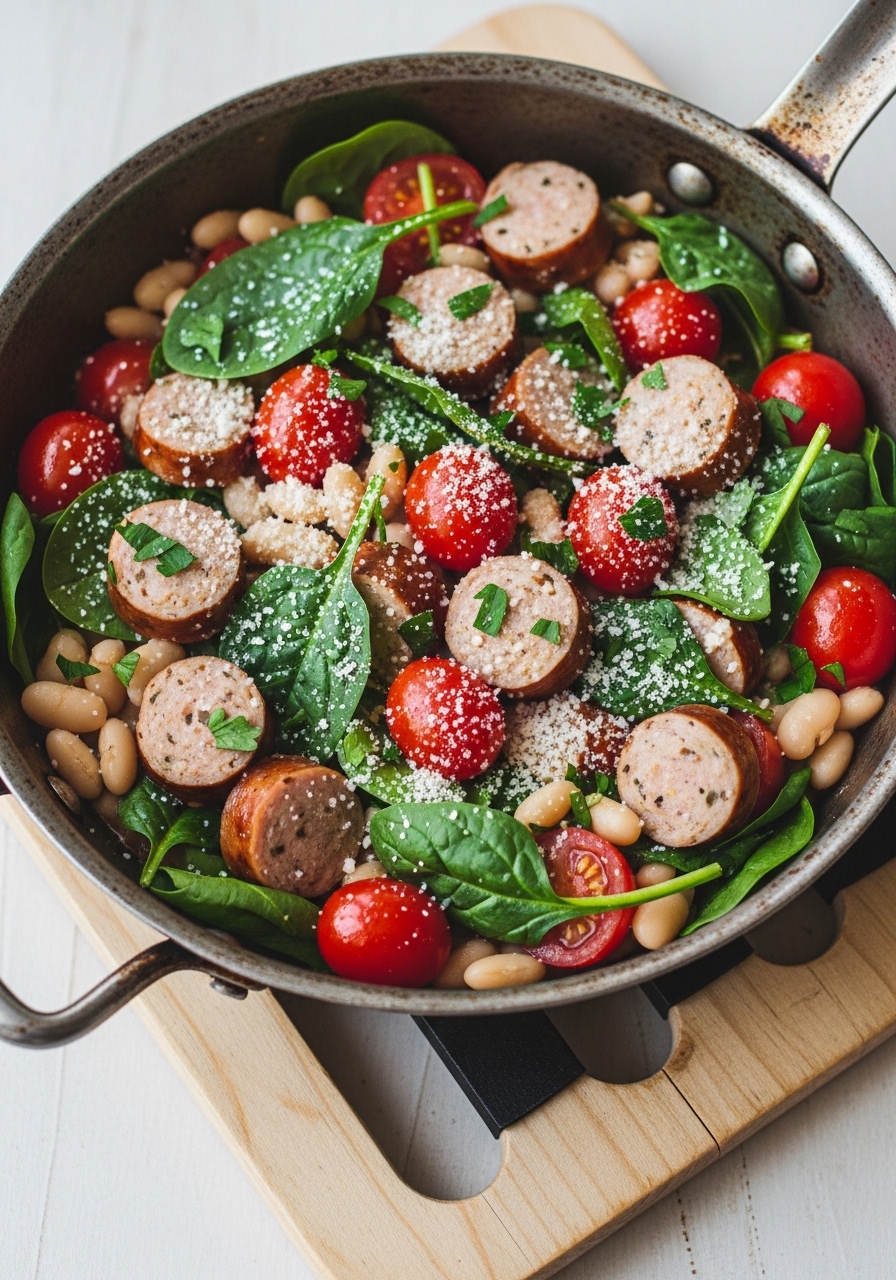 Sausage brings a spicy, smoky flavor while white beans add creamy protein and fiber. This skillet is one-pan simple and ready in about 25 minutes.