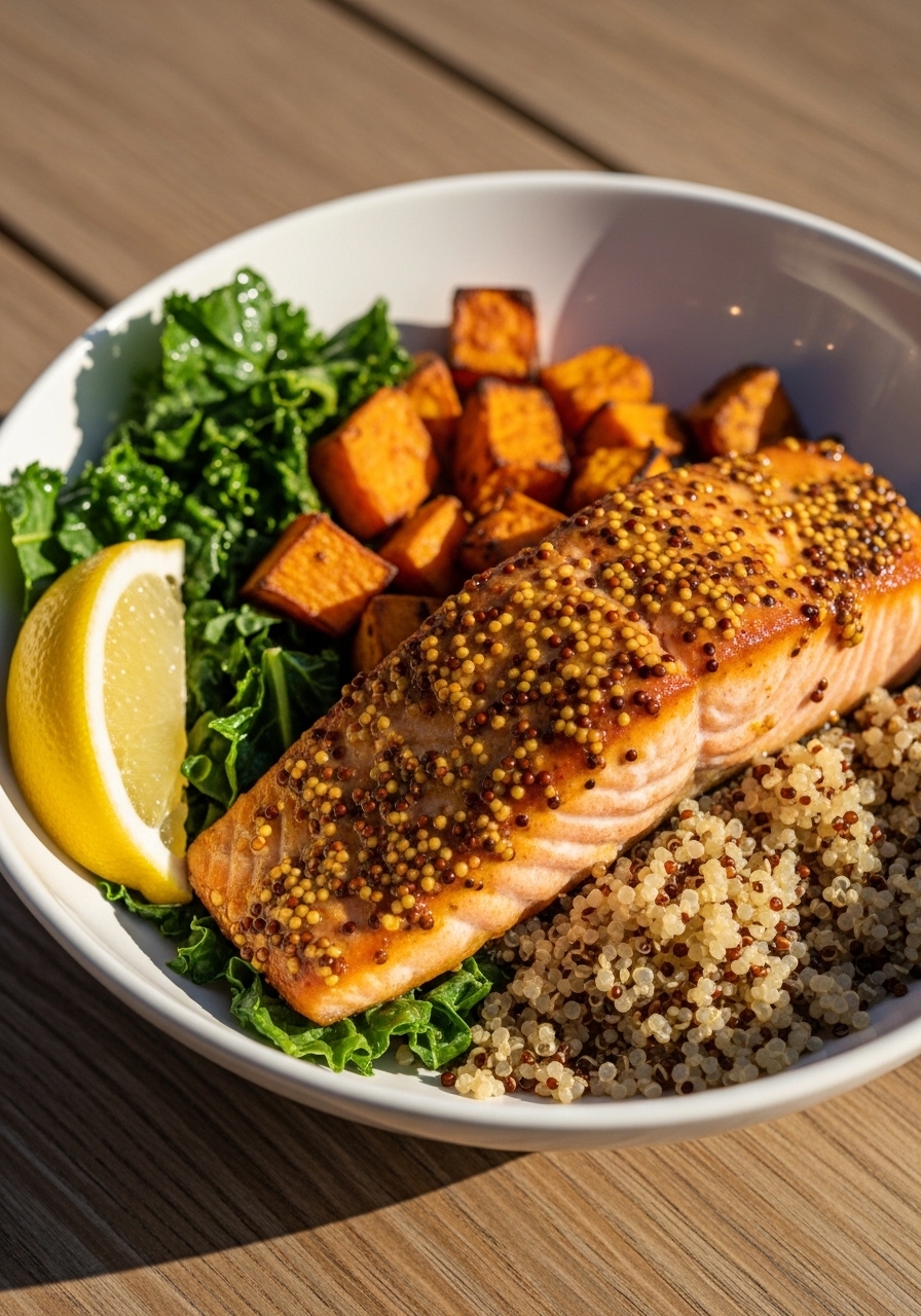 Tangy-sweet mustard-maple glaze caramelizes the salmon for bright flavor over creamy quinoa. This is a great make-ahead bowl that reheats well and keeps you full for hours. People who love sweet-savory contrasts and hearty grains will reach for this one.