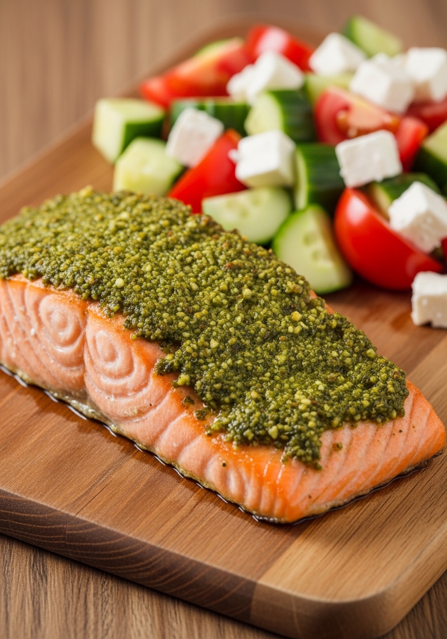 Herb-forward pesto and a quick broil make this a fresh, restaurant-style meal that’s perfect for batch prep. The arugula-mint pesto adds peppery brightness that pairs beautifully with salmon’s richness.