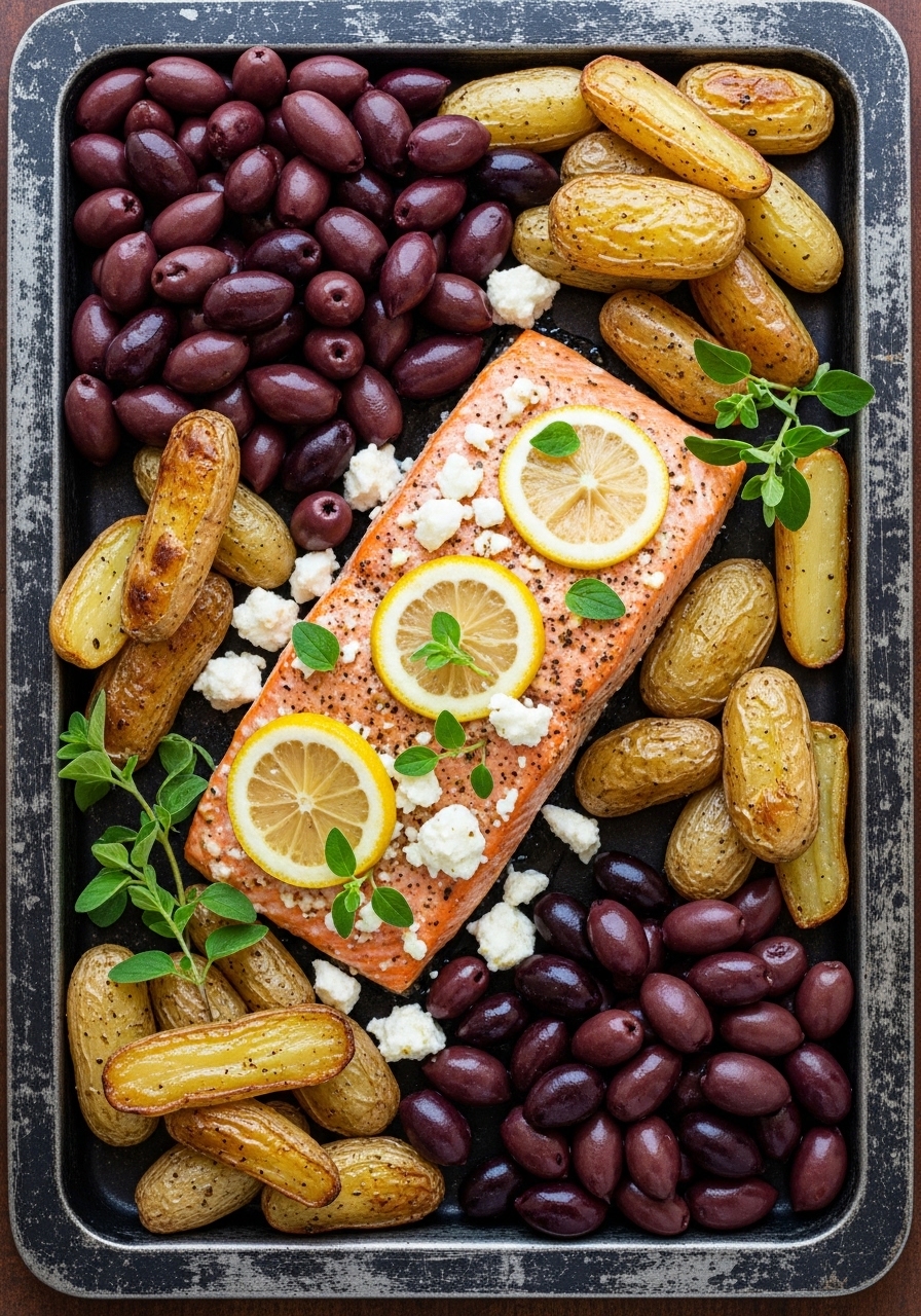 - Add salmon and olives to sheet and roast 10–12 minutes until salmon flakes.