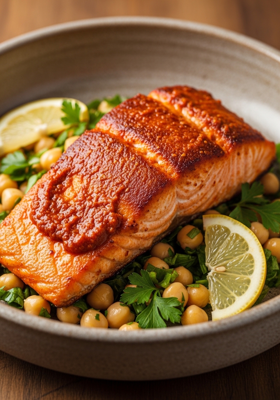 - Rub salmon with harissa and olive oil; roast 10–12 minutes until flaky.