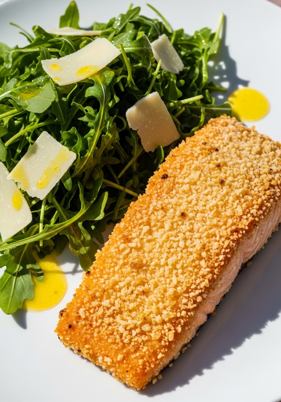 24. Panko-Crusted Lemon-Garlic Salmon with Arugula Salad