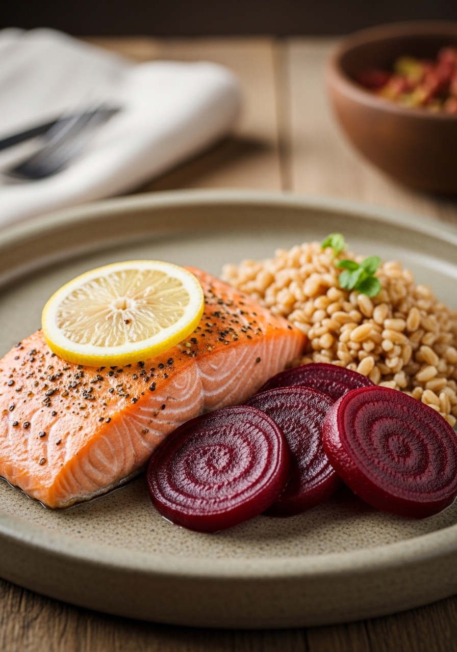 26. Lemon-Pepper Baked Salmon with Farro & Roasted Beets