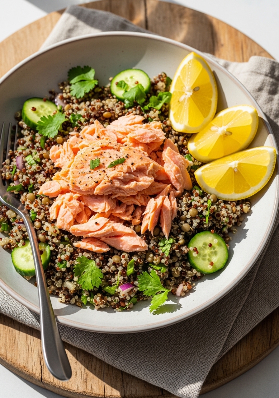 Poaching keeps salmon ultra-moist and cuts added fats—perfect when paired with a protein-rich quinoa-lentil salad for long-lasting fullness. It’s a lighter, elegant dish that feels gourmet without heavy sauces. I use a medium pot and a fine-mesh sieve to drain the quinoa perfectly.