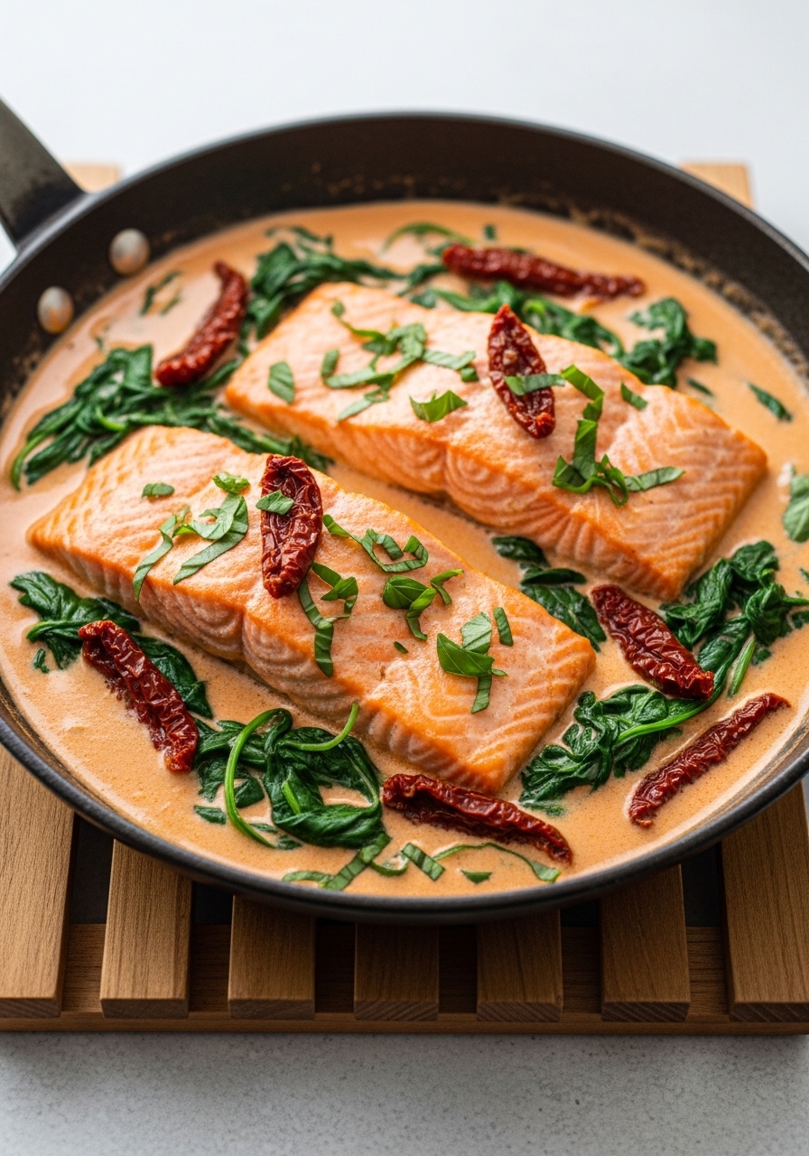 - Nestle salmon into the tomato mixture, spoon sauce over top, and cook 4–6 minutes until salmon flakes.