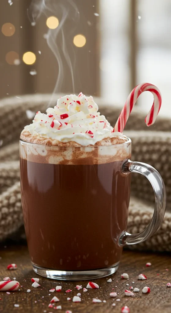Warm up with a mug of peppermint hot chocolate. Stir crushed peppermint or peppermint extract into rich hot cocoa. Top with whipped cream and candy cane pieces.