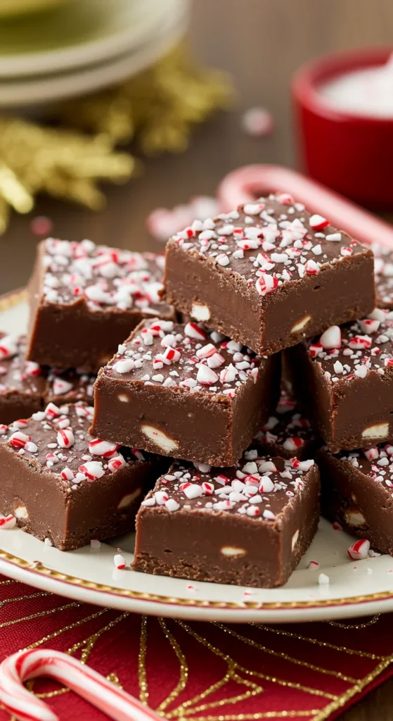 Peppermint fudge is creamy, chocolatey, and full of holiday flavor. Melt chocolate chips with condensed milk, stir in peppermint extract, and pour into a pan. Sprinkle crushed candy canes on top before chilling.