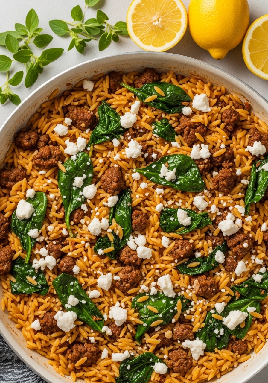 This Mediterranean-inspired skillet uses orzo and ground beef with lemon and oregano for bright flavors. Spinach folds in for color and nutrients, making a balanced one-pan dinner. Use a wide skillet for even cooking.