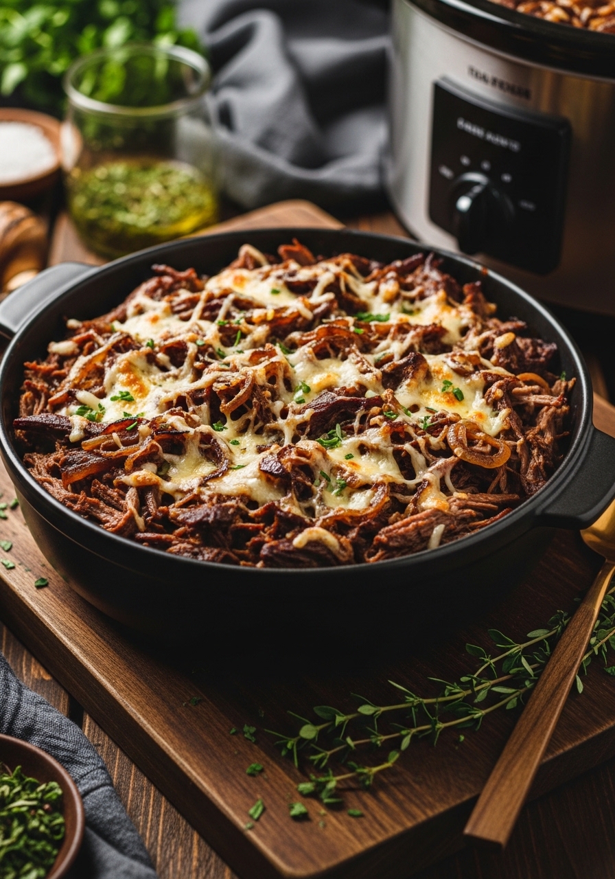 Slow-cooker pot roast infused with caramelized onions and finished with Gruyère brings soup-and-sandwich vibes minus the bread. It’s hands-off and perfect for lazy weekends or meal prep.