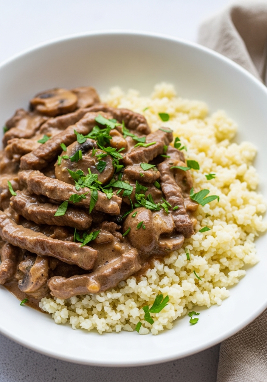 Swap noodles for cauliflower rice and keep that silky sour cream sauce. Beef strips and mushrooms make this cozy without the carbs — comforting and low-carb friendly.
