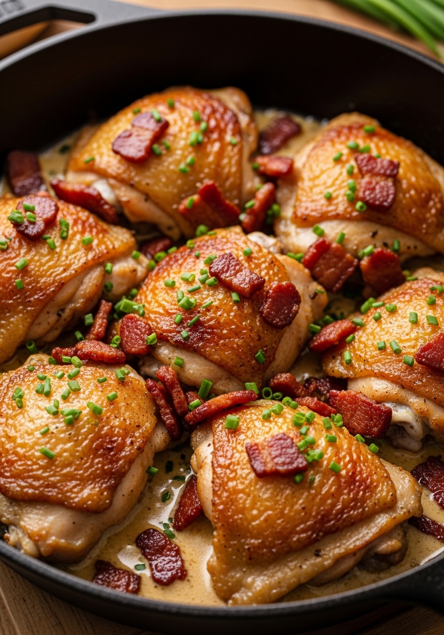 Crispy skin, smoky bacon, and a garlicky cream sauce — this skillet dinner is rich without extra carbs. Thighs stay juicy and the sauce clings to every bite.