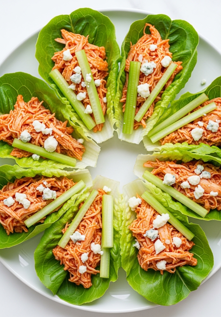 Spicy buffalo sauce meets shredded chicken tucked into crisp lettuce — crunchy, tangy and low-carb. Great for parties or quick dinners.