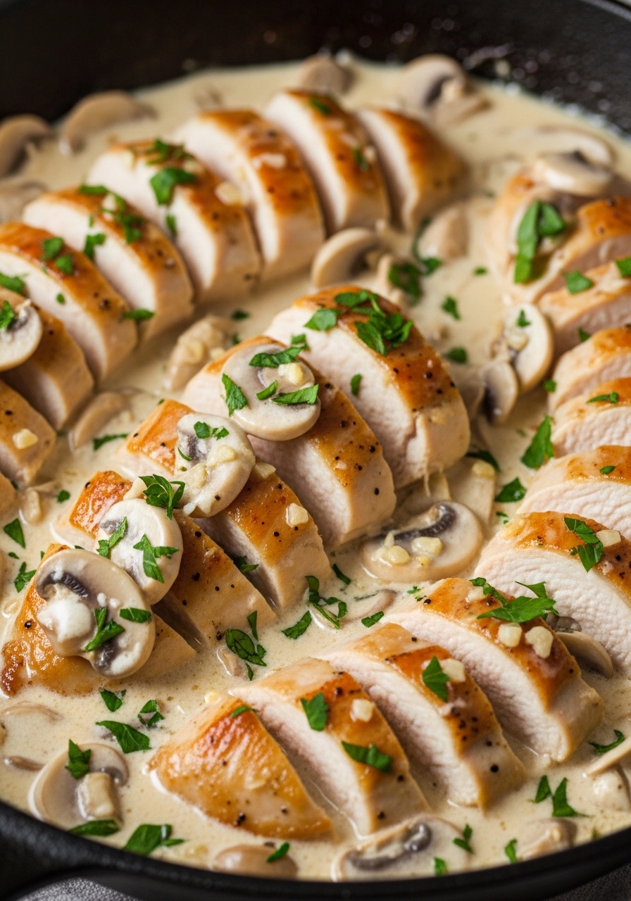 Seared chicken meets a silky garlic-mushroom cream. The sauce is layered with butter and lemon for brightness — simple, savory, and satisfying.