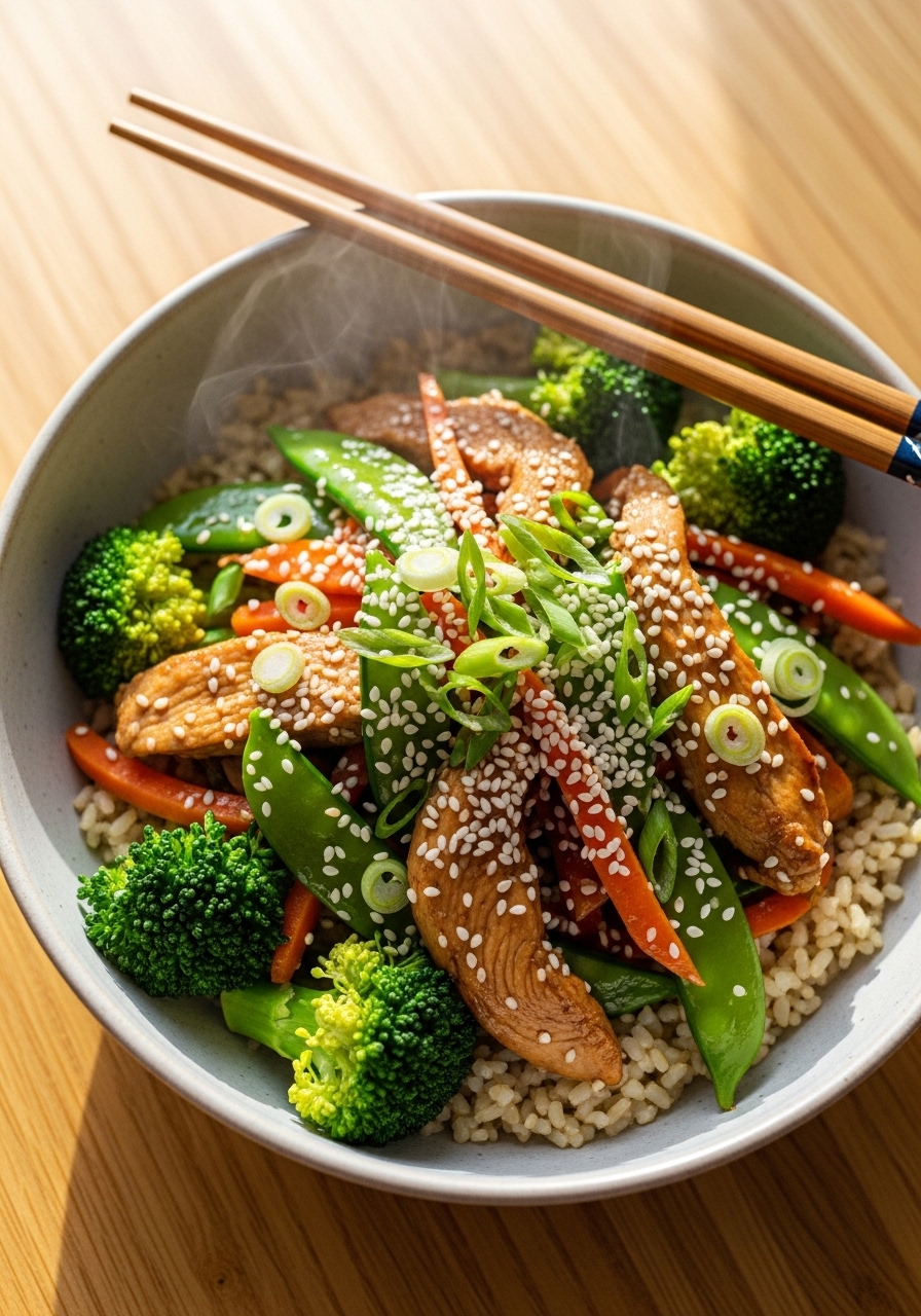 This ginger-sesame stir-fry is fast, loaded with protein, and built for weeknight wins. Crisp vegetables and a glossy sauce cling to thin-sliced chicken for a satisfying bite. If you like bold umami flavors and quick cooking, this is for you—ready in under 20 minutes.