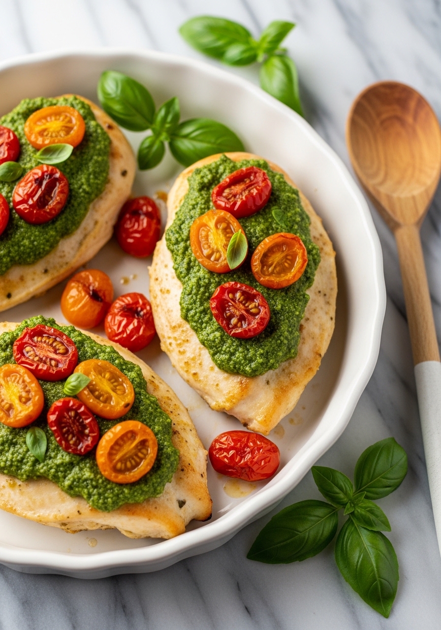 A simple spread of pesto yields herbaceous, protein-rich dinners with minimal fuss. The tomatoes burst and add sweet acidity that balances the savory chicken. Great for busy nights or casual guests—this looks fancy but comes together fast.