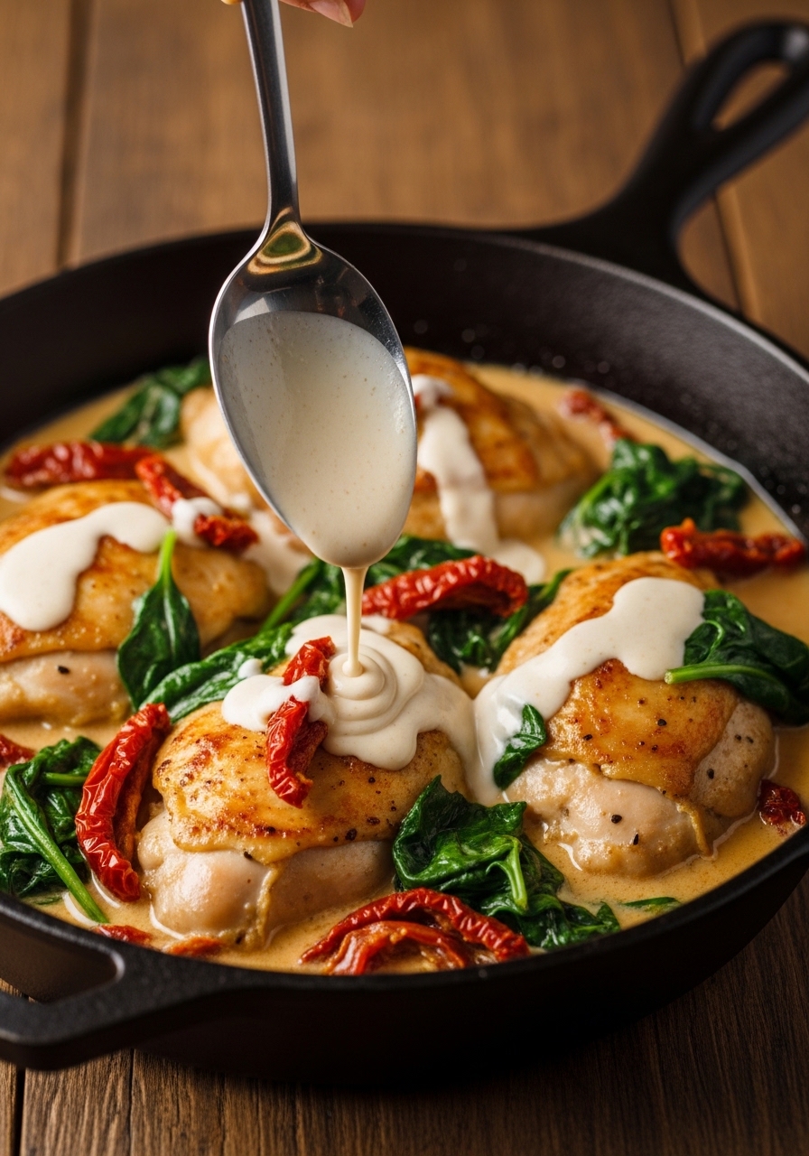 - Add sun-dried tomatoes, spinach, cream, Parmesan, and Italian seasoning; simmer until slightly thickened.