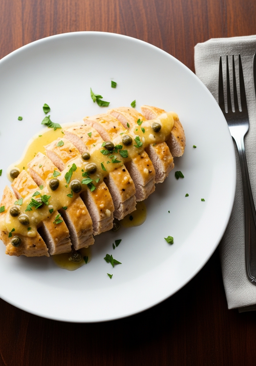- Season chicken, sear medallions 3–4 minutes per side until golden; remove.
