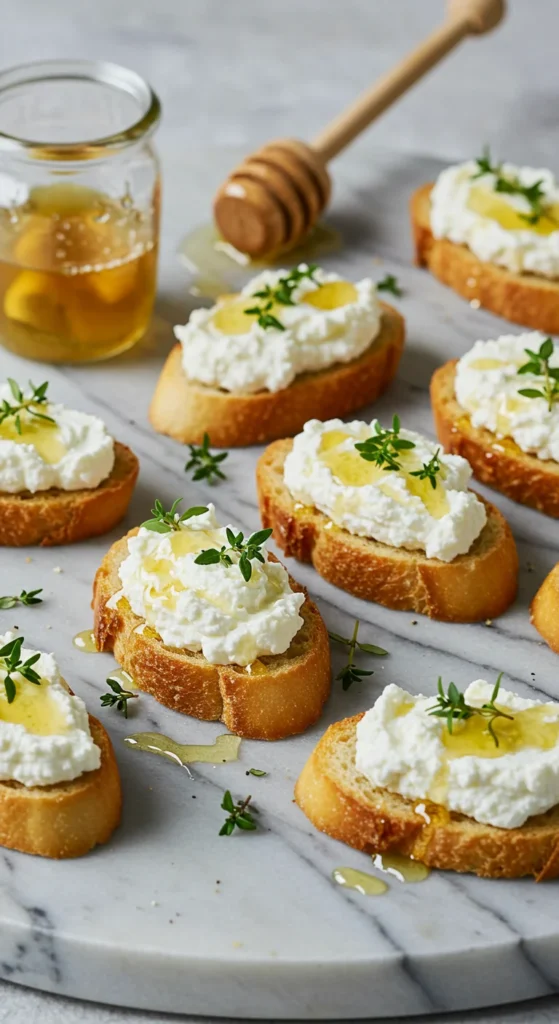 - Spread ricotta, drizzle honey, and sprinkle thyme.