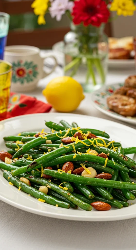Green bean almondine looks elegant but takes just minutes. Blanch green beans, then sauté with butter, garlic, and sliced almonds. Finish with lemon zest.