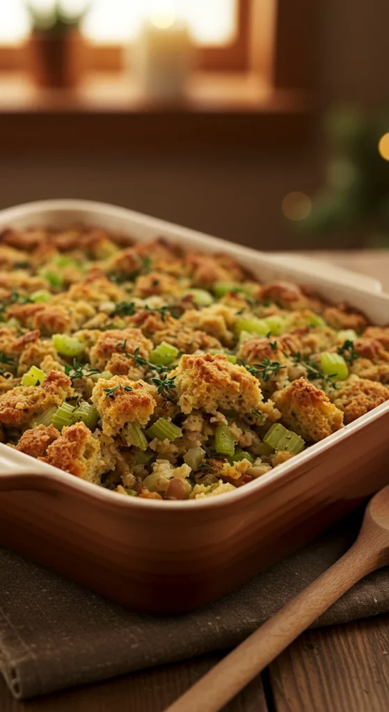 Serve straight from the baking dish for a rustic feel. Stuffing is hearty, herby, and the ultimate holiday comfort food.