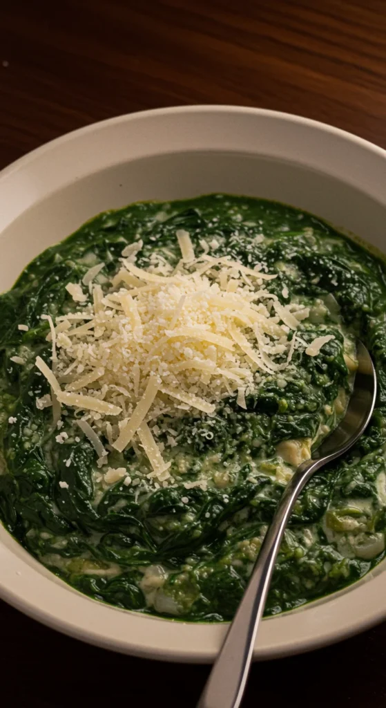 Creamed spinach is rich and velvety. Sauté garlic and onions, stir in spinach, then fold in cream and cheese until smooth.
