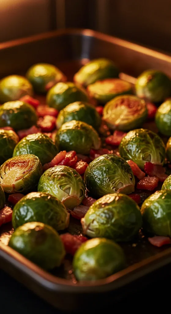 Brussels sprouts with bacon are crispy, savory, and flavorful. Halve sprouts, roast until golden, then toss with cooked bacon.