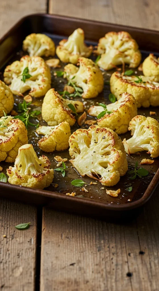 Roasted cauliflower with garlic is simple yet tasty. Toss florets with olive oil, garlic, and spices, then roast until golden.