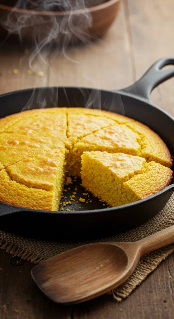 Cornbread is fluffy, slightly sweet, and perfect with gravy or stew. Mix cornmeal, flour, milk, and eggs, then bake in a skillet until golden.