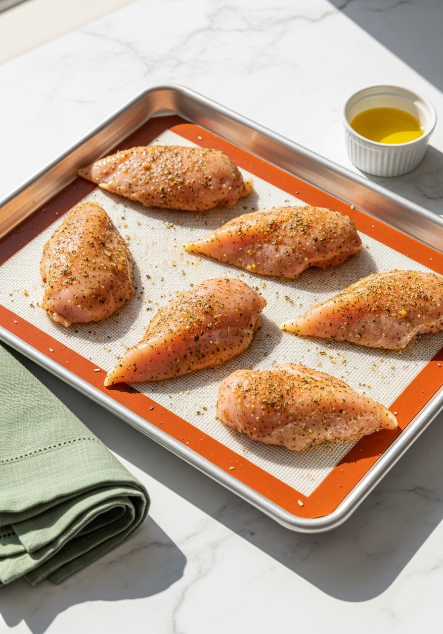 - Place breasts on a rimmed baking sheet lined with a silicone baking mat or parchment.