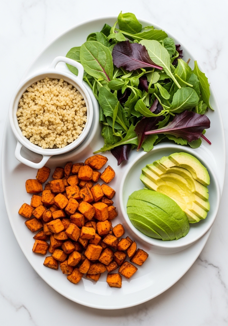 - Carbs: ½–1 cup cooked whole grains or ¾ cup roasted starchy veg (sweet potato).