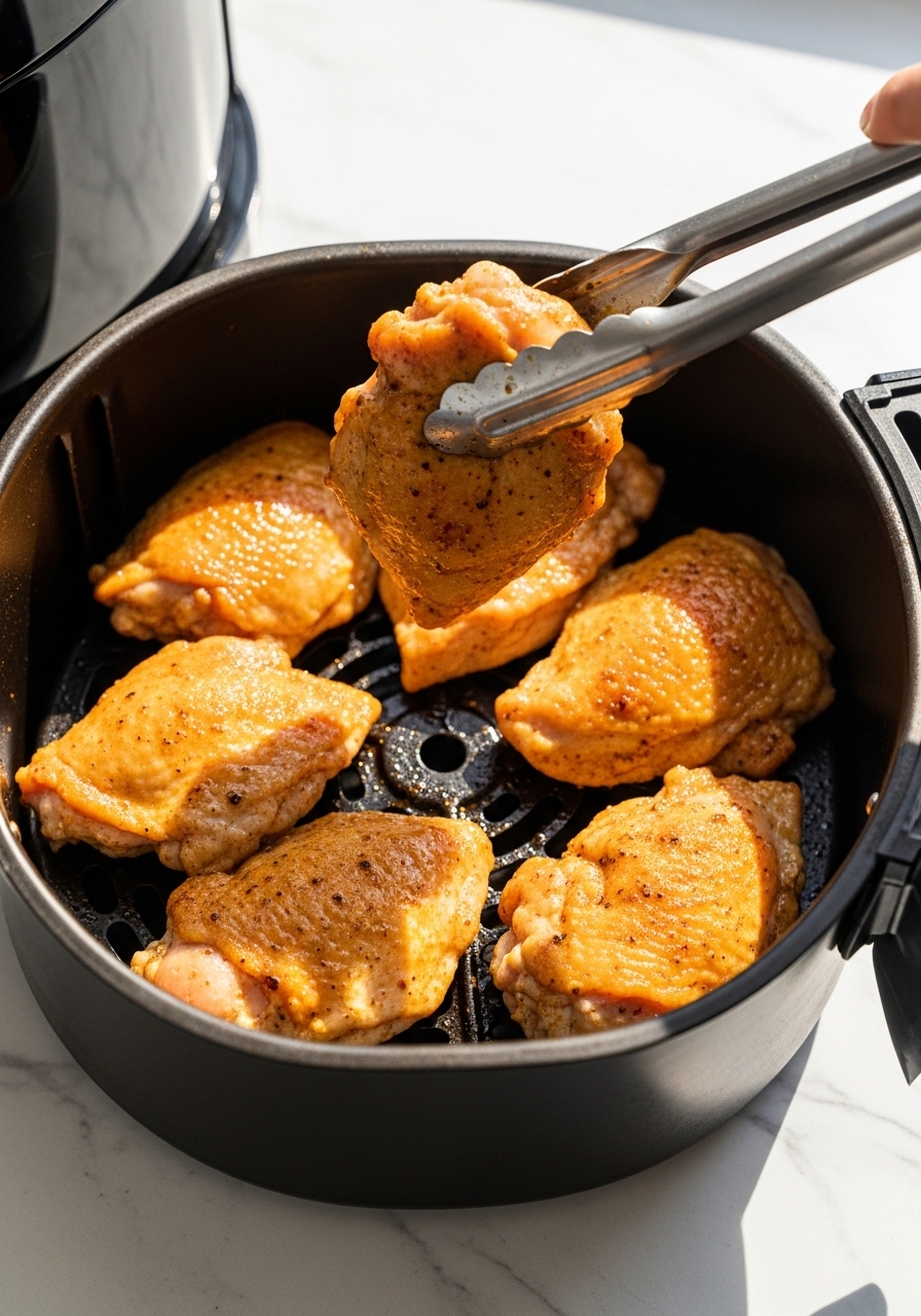 - Bone-in thighs: 18–22 minutes at 400°F, flip halfway.