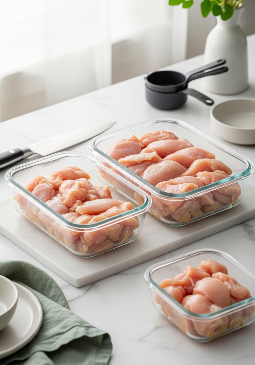 • Use clear glass meal prep bowls to organize breasts, thighs, and marinades.