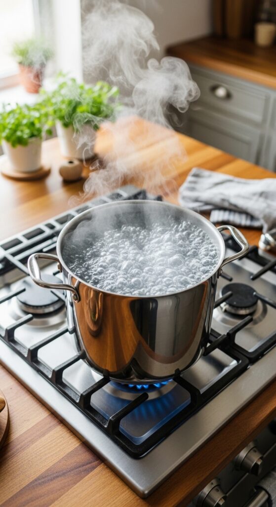 Once the water reaches a rolling boil, add salt. It should taste slightly salty — like the sea.