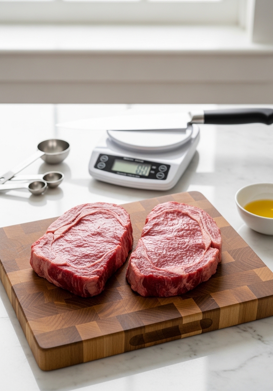 Start with steaks at room temperature: remove from fridge 30–45 minutes before cooking. Evenness matters—use a digital kitchen scale to portion steaks to 8–10 oz each so cook times stay consistent.