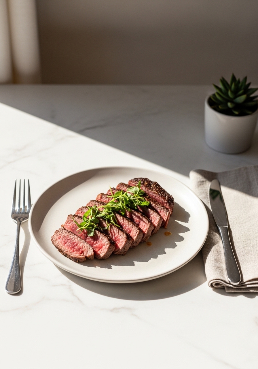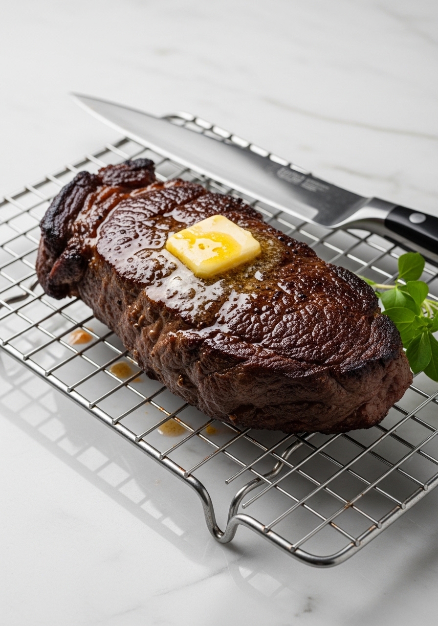 Resting is where juice retention happens. Transfer steaks to a wire cooling rack or plate and rest 5–10 minutes. This lets carryover heat finish the cooking without toughening the meat.
