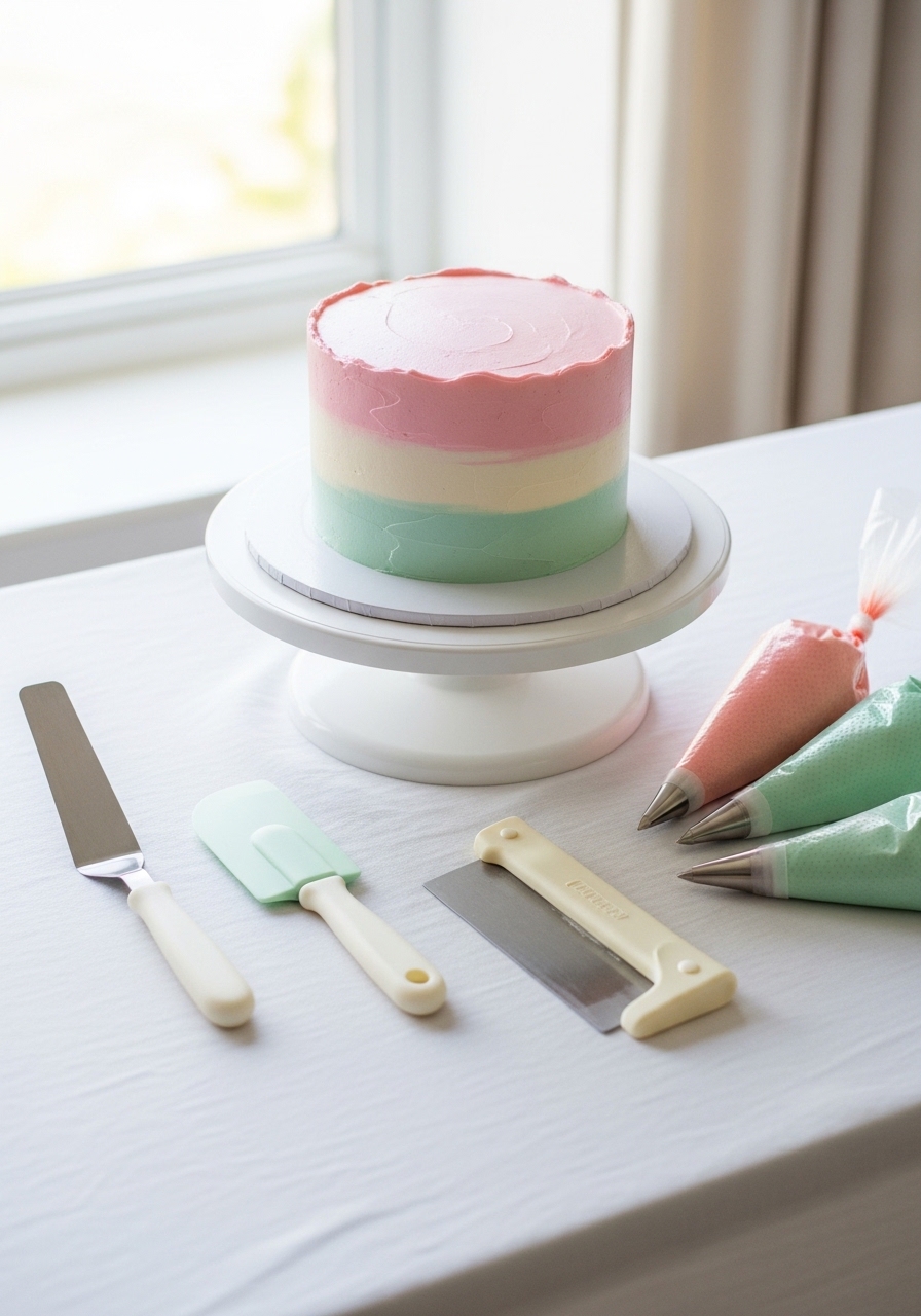 Prep saves time and keeps your cake neat. Center your tools: a cake turntable, an offset spatula, a bench scraper and a couple of piping bags. A turntable makes smoothing much easier; spin, don’t tug.