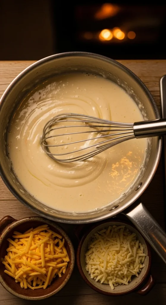 Melt butter, whisk in flour, and let it thicken into a light roux. Slowly whisk in warm milk until smooth and velvety.