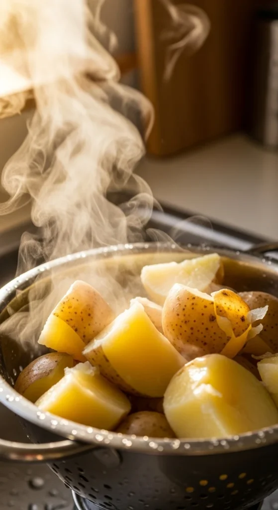 Drain well and let the potatoes sit in the pot for 2–3 minutes. This dries the excess water and helps the potatoes absorb cream and butter better.