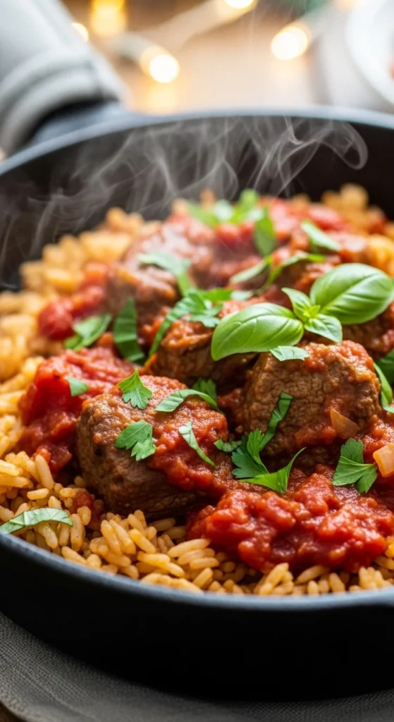 Sauté the meat with onions and garlic. Add tomato sauce, rice, and seasonings. Simmer a few minutes so the flavors blend.